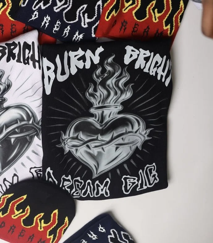 • Front: “Burn Bright, Dream Big” with signature flaming heart design
